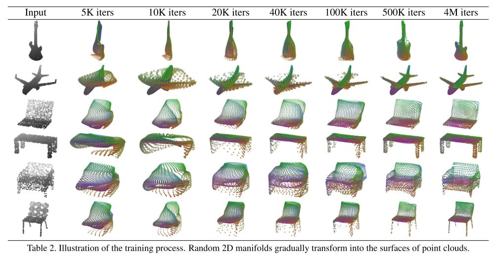 如表2所示,随着FoldingNet的训练,随机的二维流形逐渐地变换到点云的表面