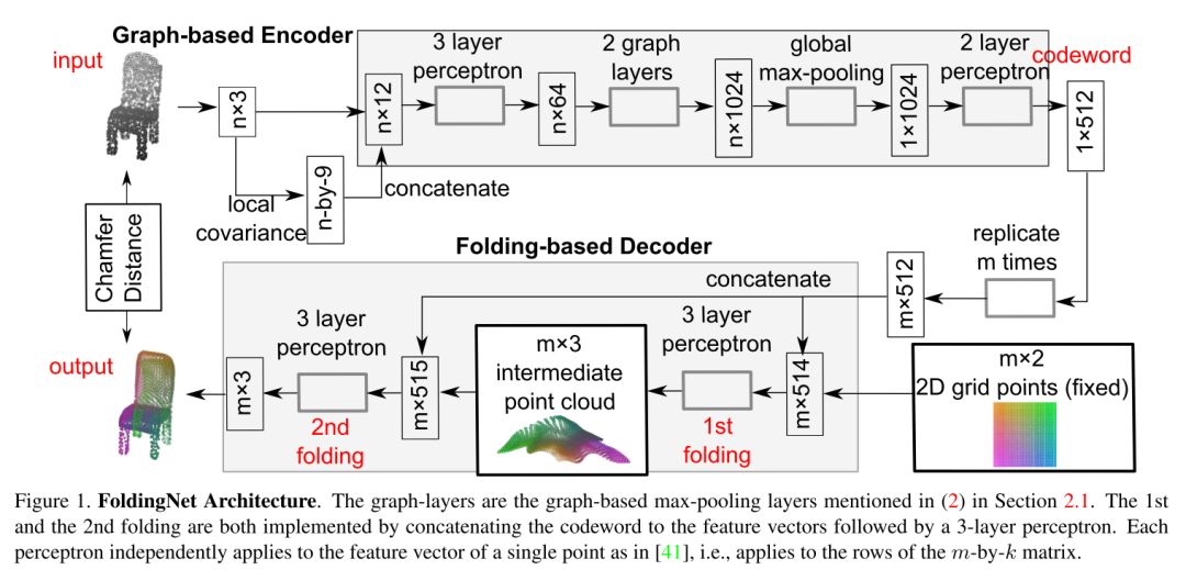 稍后将说明折叠操作可以在提供适当代码字的情况下构建任意表面。注意,当数据是体素格式而不是二维表面时,一个三维栅格可能表现更好。FoldingNet 网络结构如图1所示。