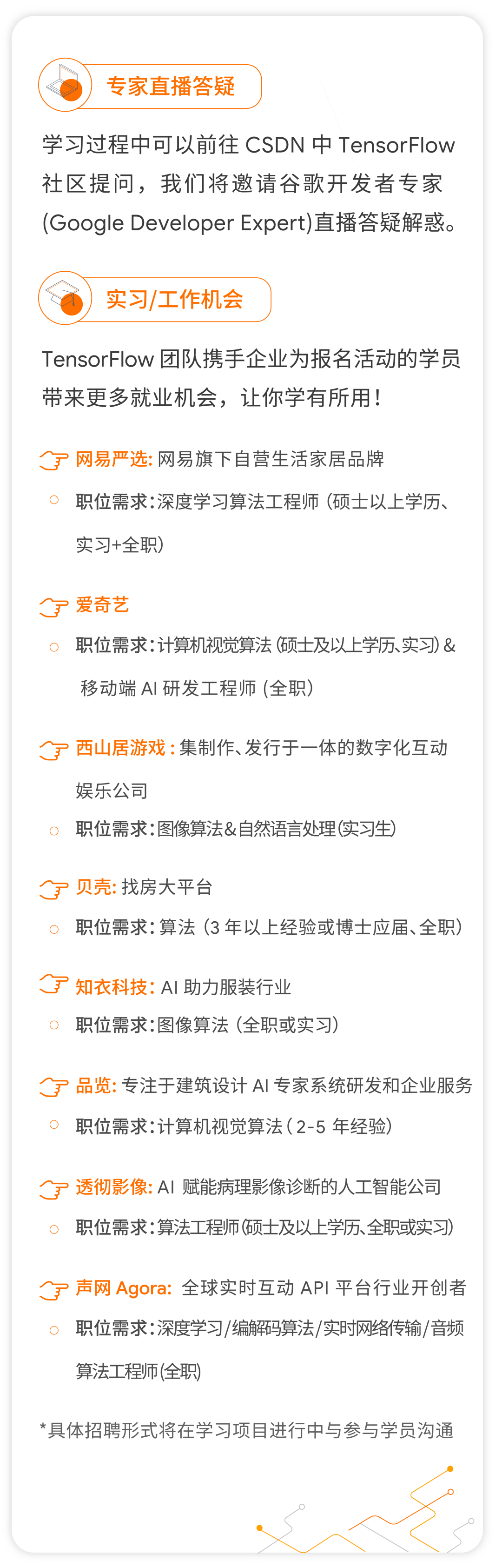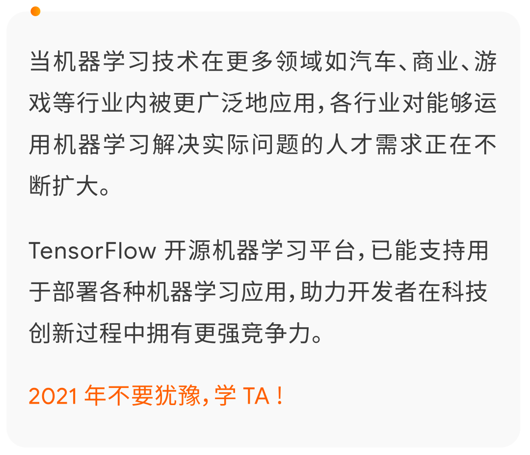 要初步了解 TensorFlow 的用户。这次学什么:了解机器学习的设计思路和基本方法,体验 TensorFlow 的最佳实践模式;借免费算力支持的线上实训平台,进行线上实操练习训练,更快地学以致用;通过中国大学 MOOC 平台上的视频课程与实训平台,实现从入门到深入理解构建机器学习模型时遇到的主要概念和场景。这次学什么:了解机器学习的设计思路和基本方法,体验 TensorFlow 的最佳实践模式;借免费算力支持的线上实训平台,进行线上实操练习训练,更快地学以致用;通过中国大学 MOOC 平台上的视频课程与实训平台,实现从入门到深入理解构建机器学习模型时遇到的主要概念和场景课程内容:第一部分:TensorFlow 深度学习的第一门课程第二部分:机器视觉 - 图像分类第三部分:自然语言处理第四部分:序列,时间序列和预测第五部分:TensorFlow Lite 介绍