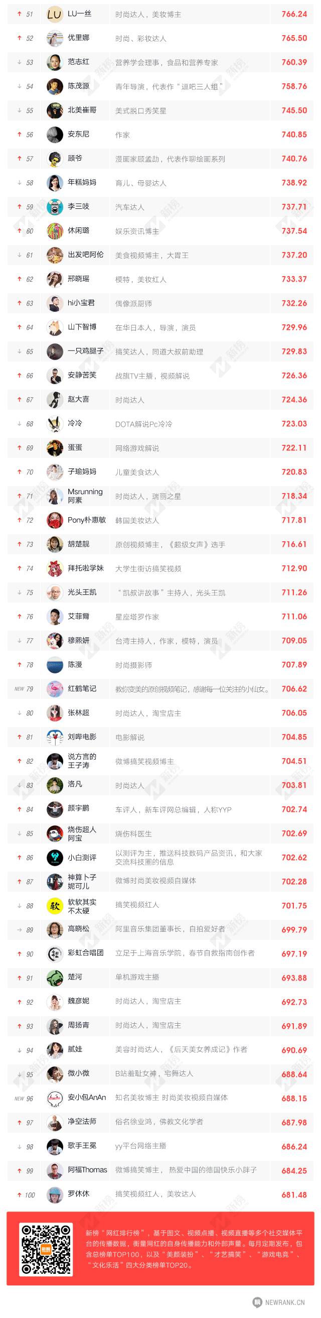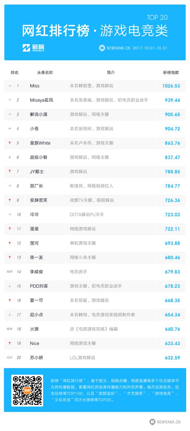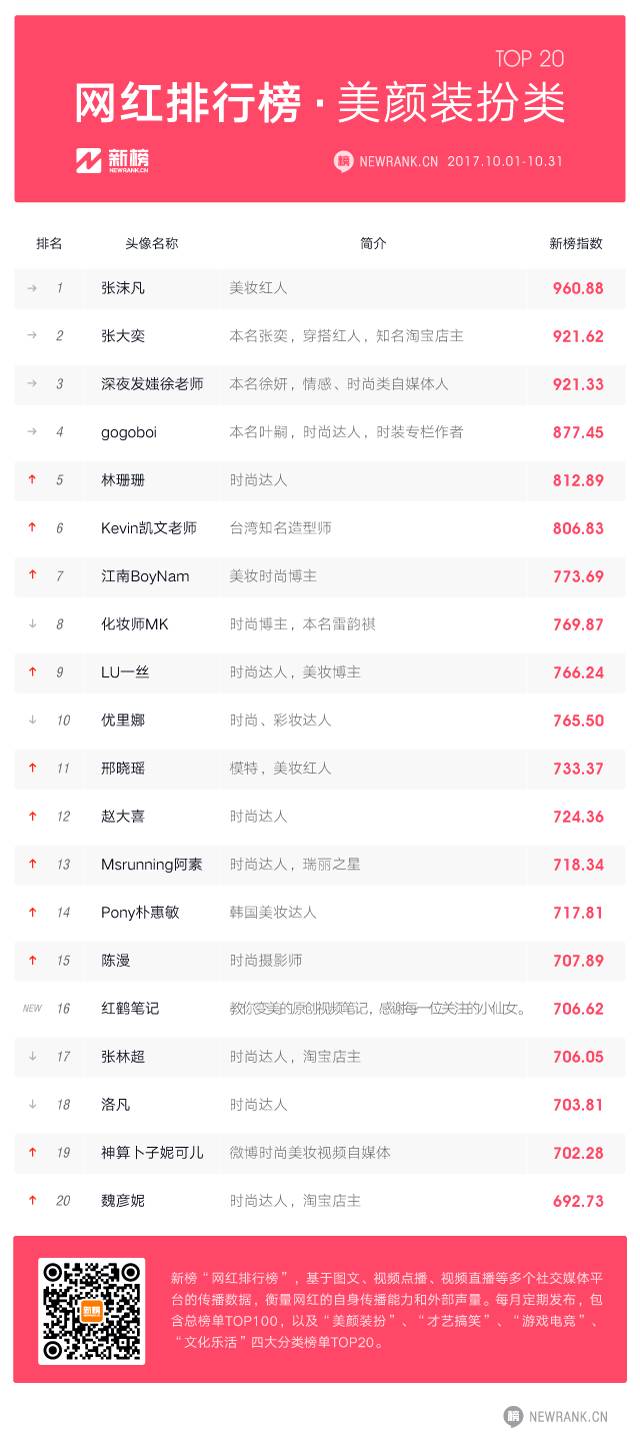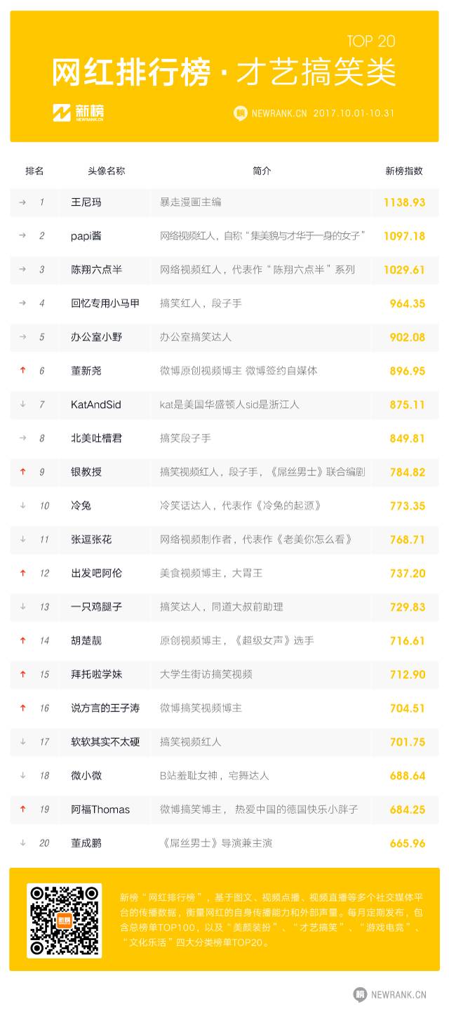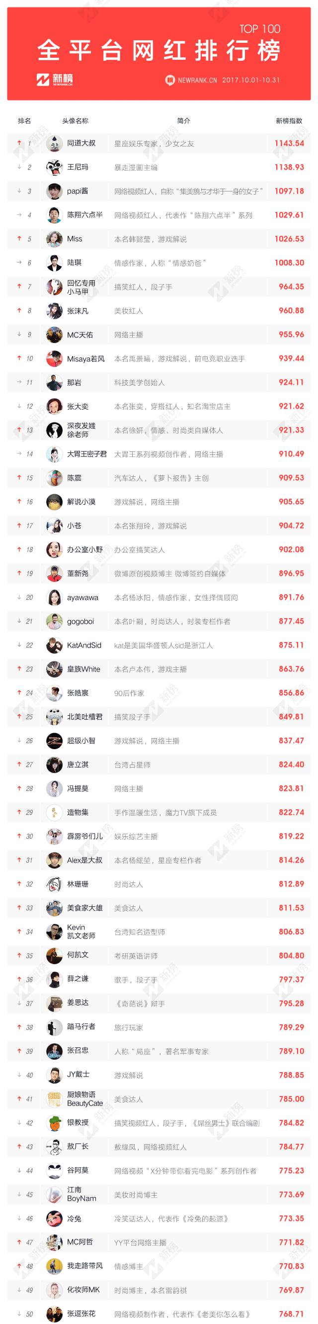 新榜今日发布2017年10月全平台网红排行榜,对于“网红”,我们的定义标准力求“纯粹”“典型”,必须具备以下特征: