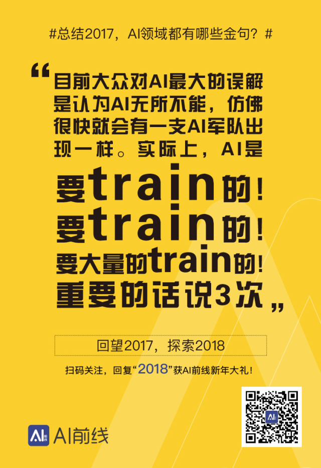 在这里首先要感谢AI前线的读者们在过去一年里一直陪伴着我们,共同见证了过去这一年人工智能的快速发展。同时感谢各位给AI前线提供稿件、分享、素材、翻译和专业意见的专家老师、译者,正是因为有了你们,才有了AI前线丰富的内容干货。