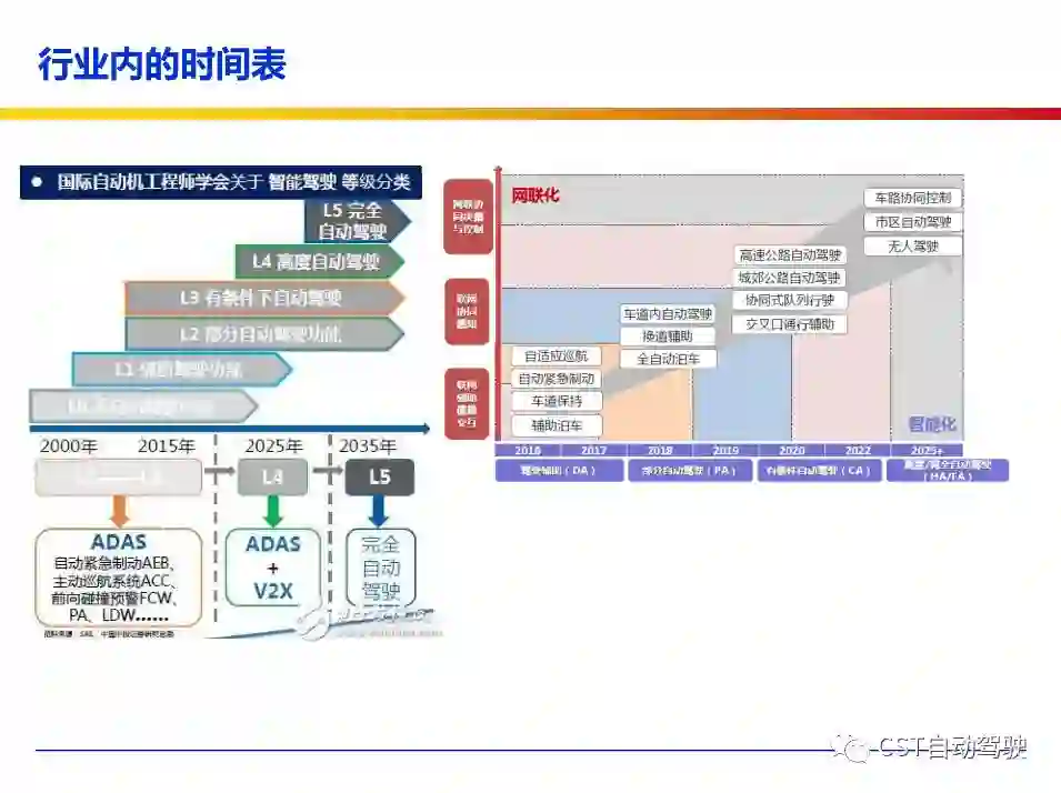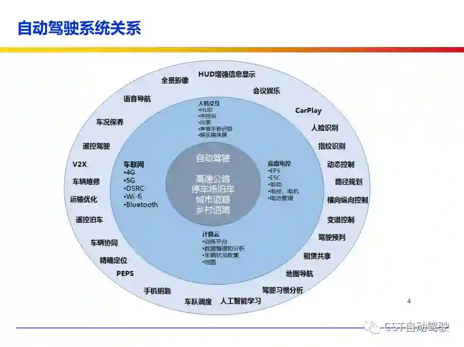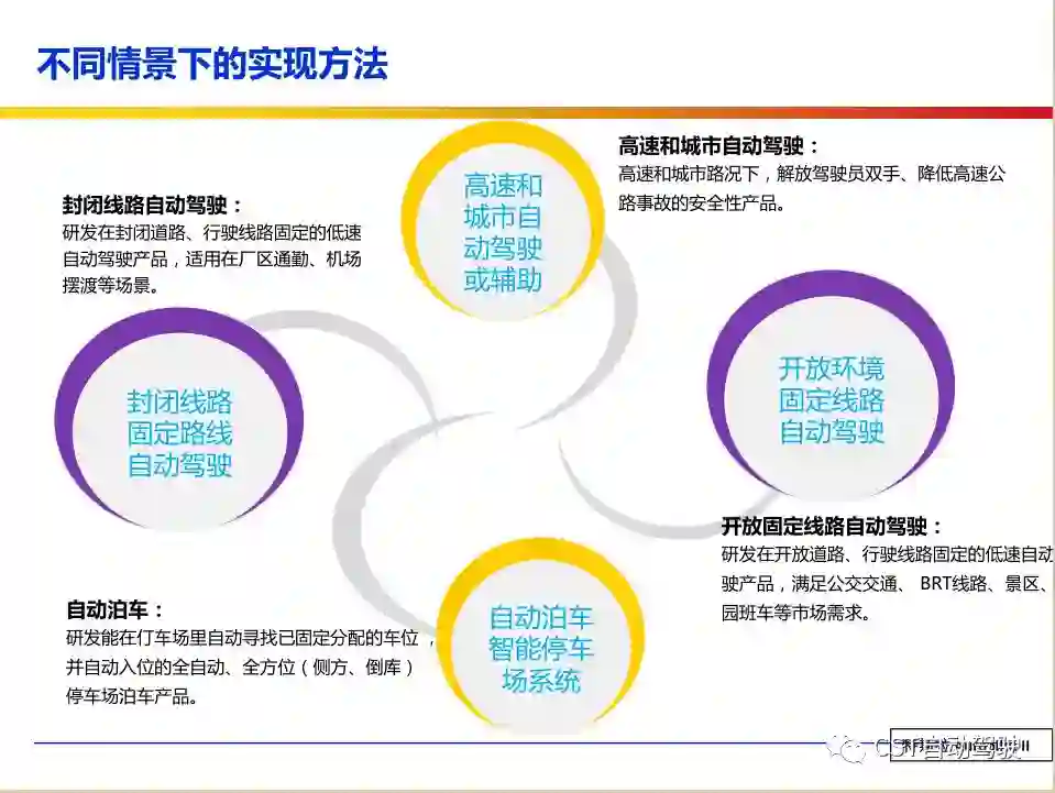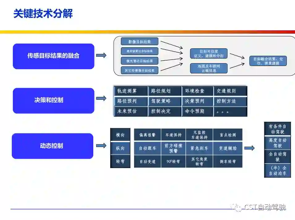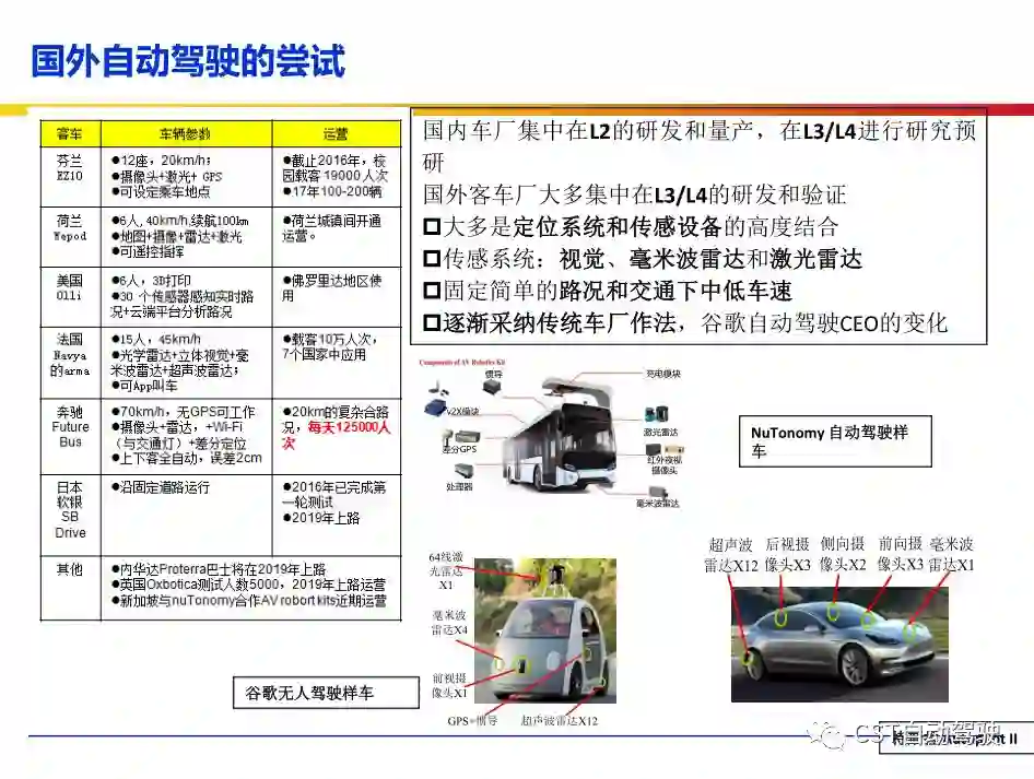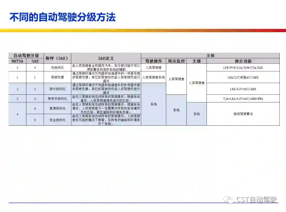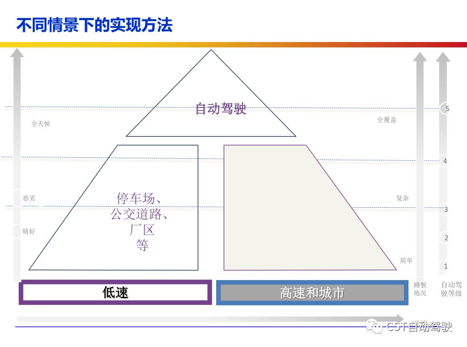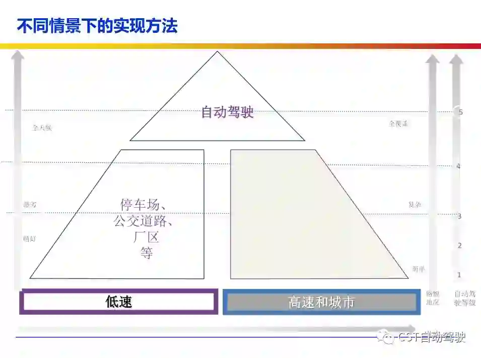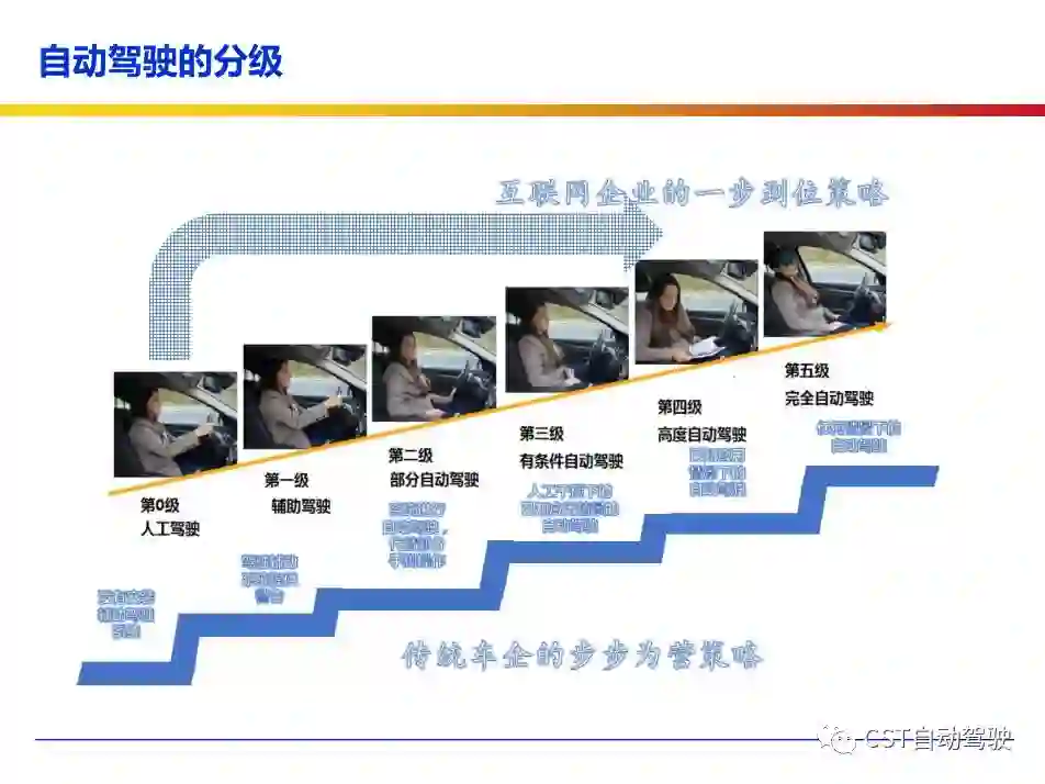车辆的自动化发展从低到高可以分为驾驶资源辅助、部分自动化、有条件自动化、高度自动化和完全自动化 [2] 5 个阶段。