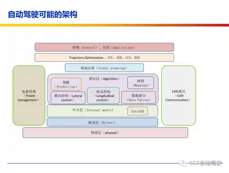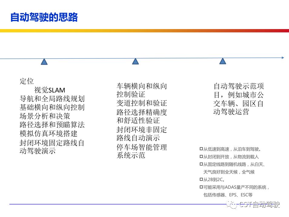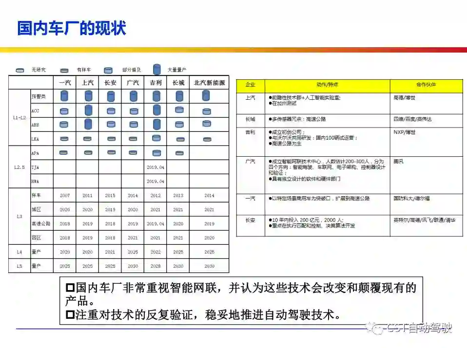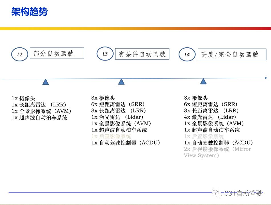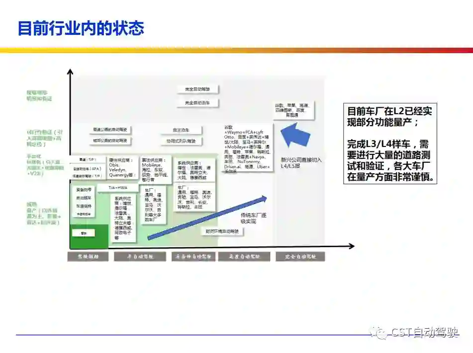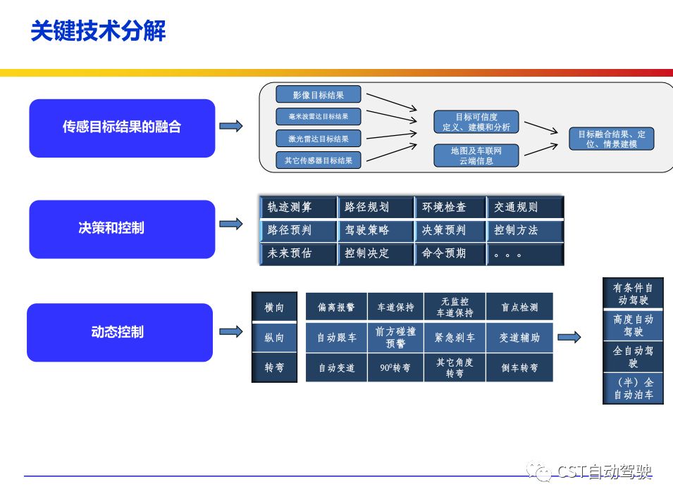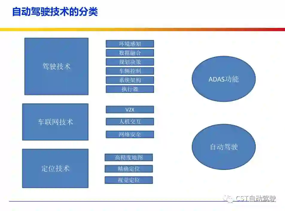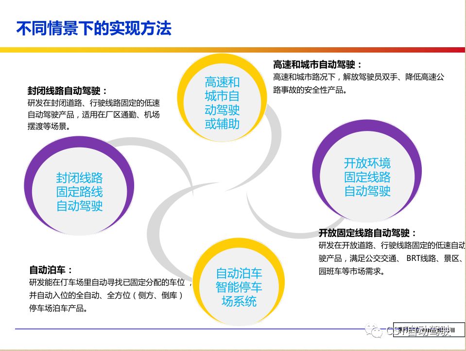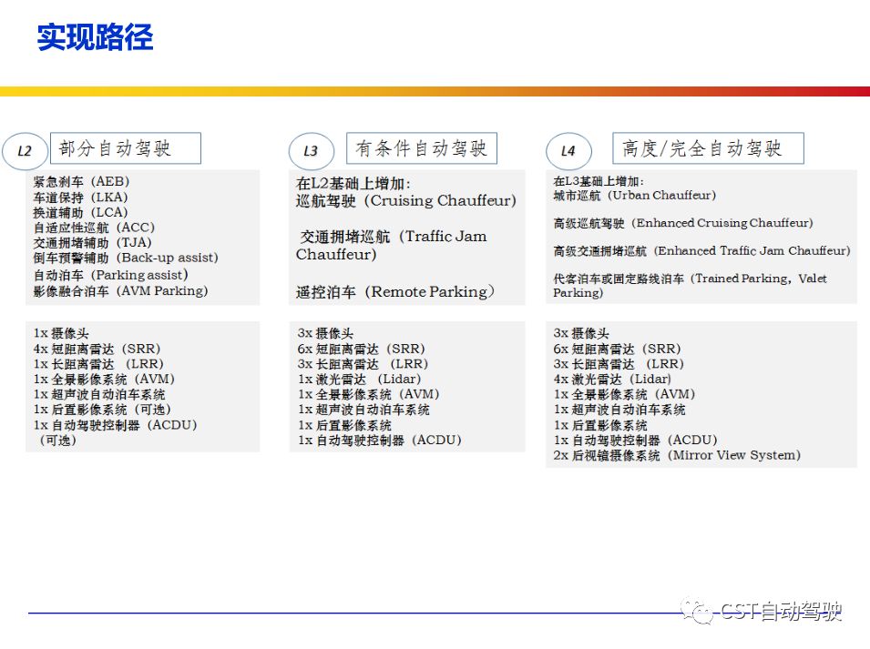 车辆的自动化发展从低到高可以分为驾驶资源辅助、部分自动化、有条件自动化、高度自动化和完全自动化 [2] 5 个阶段。