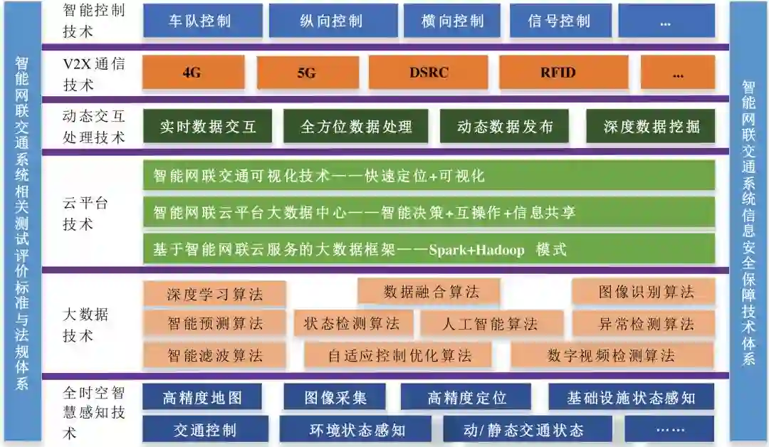 智能网联交通系统融合智能汽车与智能道路的技术优势,涉及汽车、道路交通、计算机、通讯等诸多领域,其包括六大关键技术及两大保障体系。