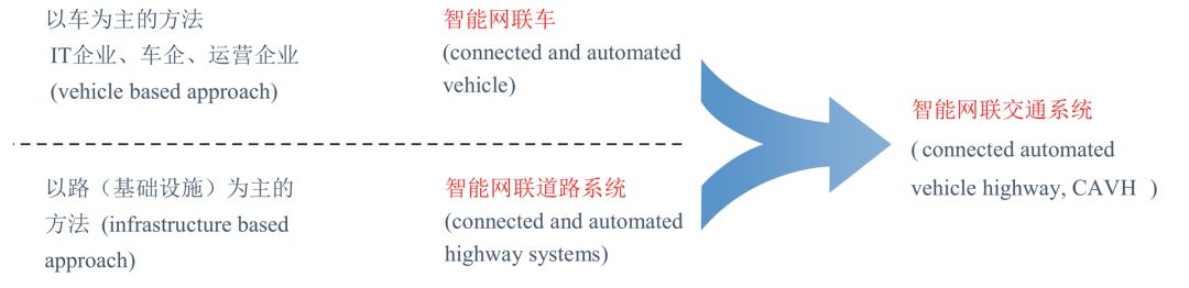 就技术发展路径而言,目前智能网联交通系统分为 2 个发展方向,即智能网联汽车和智能网联道路,如图 3 所示。IT 企业、车企和运营企业主要开展以车为主的智能网联汽车技术研究;道路交通行业以路为主进行智能网联道路系统研究。智能网联交通系统融合了智能网联汽车与智能网联道路的技术优势,协调发展,最终实现自动驾驶。