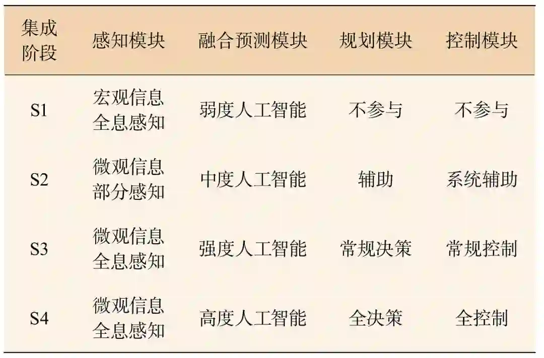 智能网联交通系统包括感知模块、融合预测模块、规划模块和控制模块等 4 个关键部分。在系统集成化不同阶段,关键模块参与程度不同,如表 1 所示: