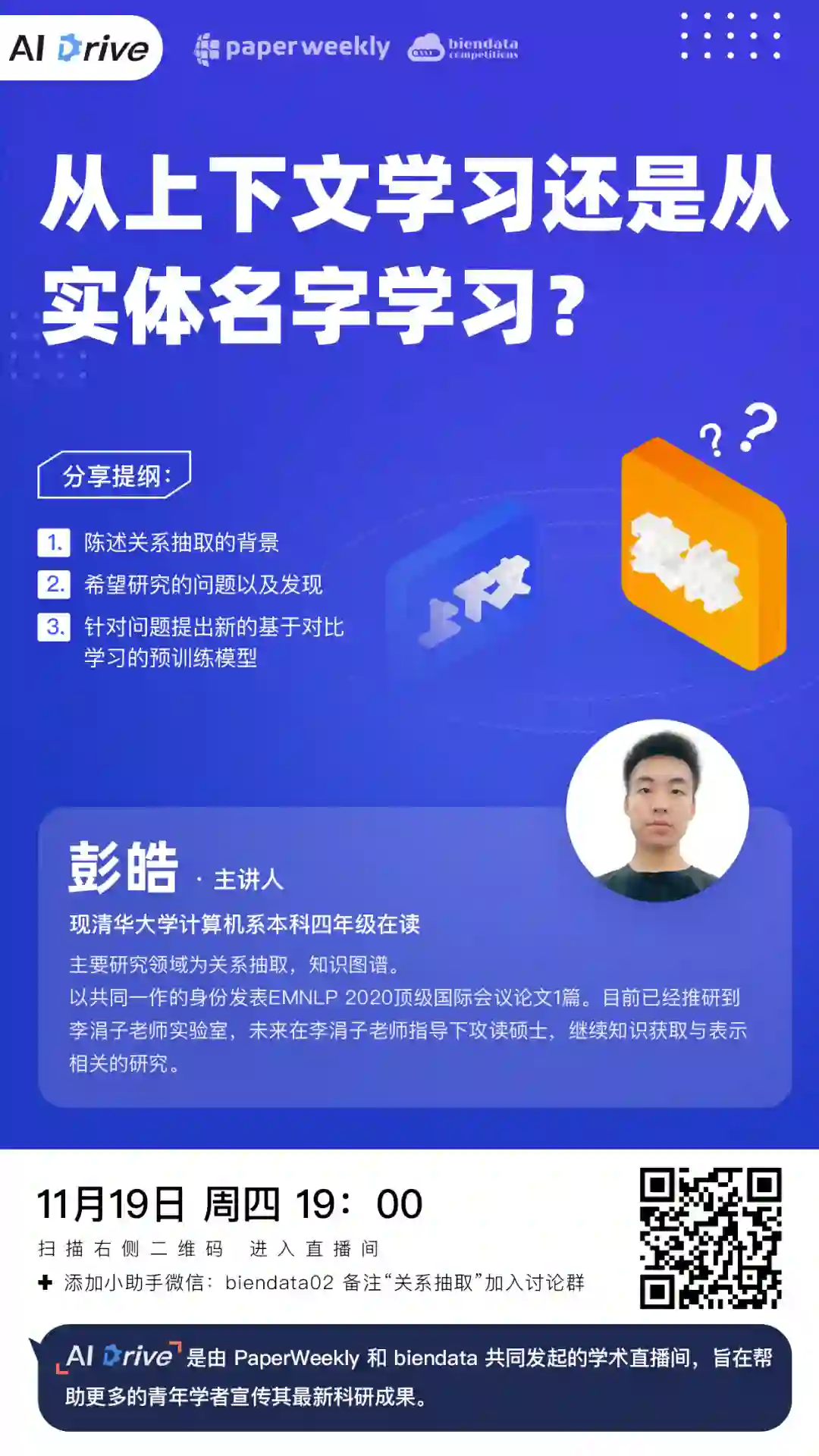 本期 AI Drive,我们邀请到清华大学计算机系本科生彭皓,为大家解读其发表于 EMNLP 2020 的最新工作。对本期主题感兴趣的小伙伴,11 月 19日(周四)晚 7 点,我们准时相约 PaperWeekly B 站直播间。