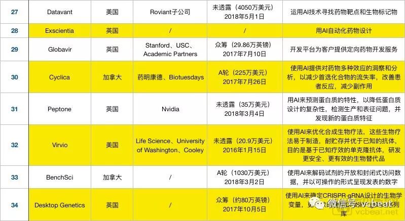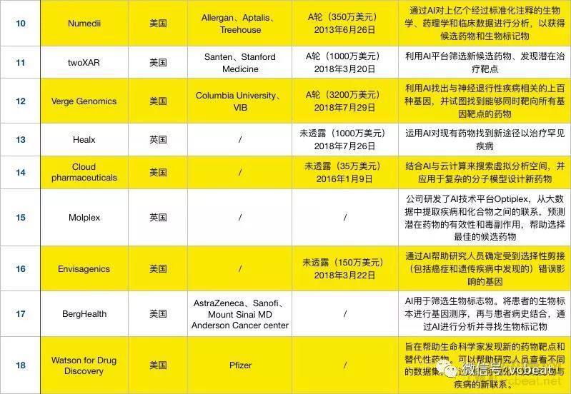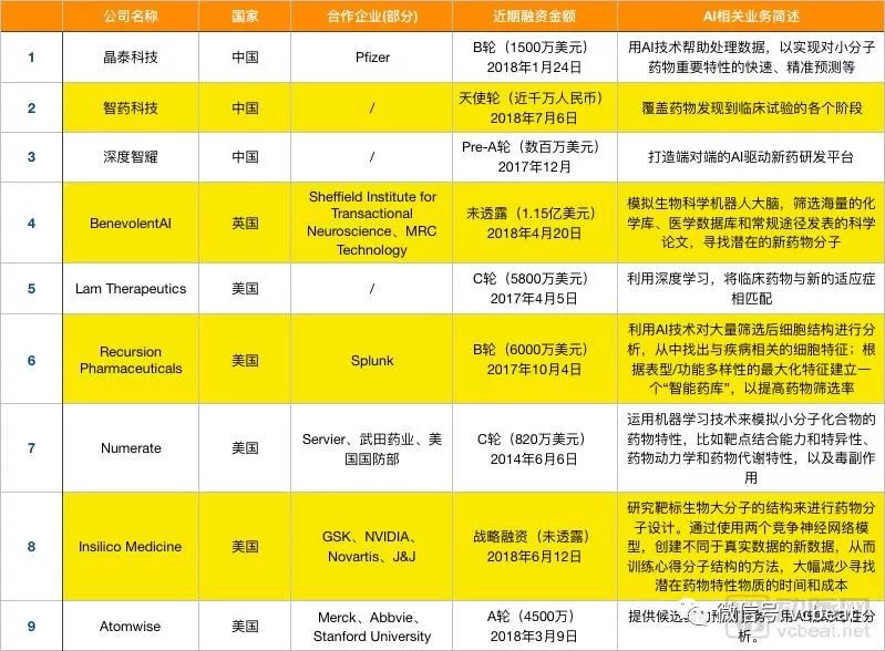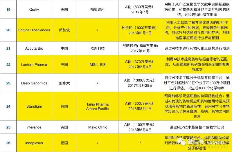 相比于2017年,国内在2018年新增了智药科技、深度智耀、AccutarBio、零氪科技四家企业利用AI技术深入药物研发,表格之外仍有不少药企正在开放针对性的深度学习算法。