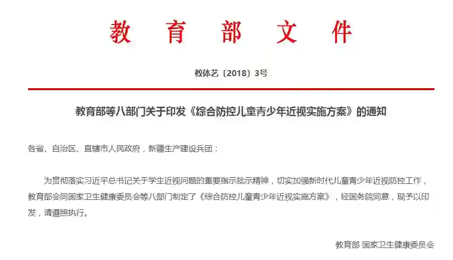 8月30日,经国务院同意,教育部、国家卫生健康委员会、国家体育总局、财政部、人力资源和社会保障部、国家市场监督管理总局、国家新闻出版署、国家广播电视总局等八部门联合印发《综合防控儿童青少年近视实施方案》。