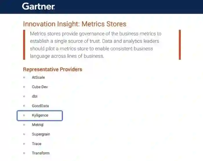 在海外,近年来有关现代化数据堆栈的谈论持续掀起热浪。从更广阔的视角来看,指标中台其实就是现代化数据堆栈中一个非常重要的组成部分,在 Gartner 最新发布的 《指标中台创新洞察报告》(Innovation Insight: Metrics Stores) 中也证实了这一点,同时该报告将 Kyligence 列为指标中台的代表厂商。