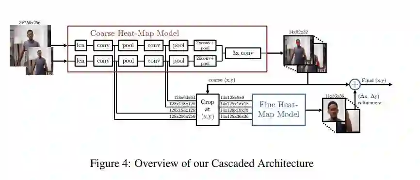 从本质上讲,该模型包括用于粗定位的基于热图的部件模型、用于在每个关节的指定(x,y)位置采样和裁剪卷积特征的模块以及用于微调的附加卷积模型。