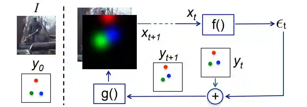 g(yt+1) 中的每个关键点yt+1转换为热图通道,以便它们可以堆叠到图像I中,进而也是为了形成下一个迭代过程的输入。这个过程重复T次,直到我们得到一个精炼的yt+1,并通过添加εt,进而来更接近标准真值。
