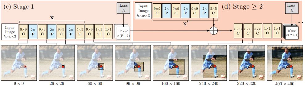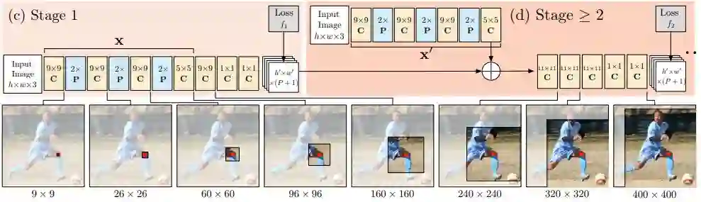 CPM(卷积姿态机)通常包含不止两个阶段,阶段数目一般来讲都是超参数,通常取3。第一阶段是固定的,大于2的阶段一般都只是阶段2的重复。第2阶段将热图和图像证据作为输入。输入的热图为下一个阶段增添了空间背景。(已经在论文中进行了详细的阐述与讨论)