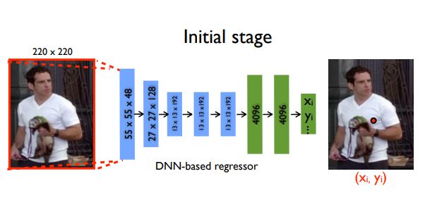 该模型由一个Alexnet后端(7层)和一个额外的最终层组成,这个最终层的输出为2k关节坐标。(xi,yi)∗2 for i∈{1,2…k},k为关节数量