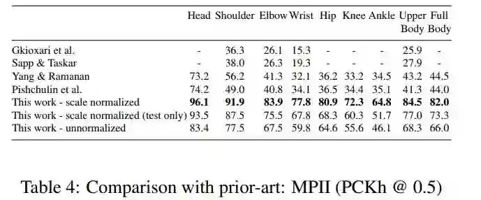 本文使用了LSP(Leeds sports dataset,利兹[2]运动数据集)和FLIC(Frames Labeled In Cinema,电影院标记帧)数据集进行实验,并以PCP(Percentage of Correct Parts,部件正确率)指标和其他方法进行了比较。查看附录,可以找到一些主流的评估指标(如PCP&PCK)的定义。