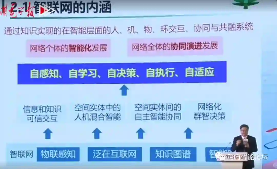 全方位、智能、自主的感知是智联网的基层,宽带、泛在、多尺度是智联网的网络特征,数据即智能的边缘与云化是智联网的计算特征,提供个性化的智慧服务是智联网的目标。终端已经充分计算化,都在做没有服务器的计算。特斯拉充电后,上面就可以装足够的服务器,这就是未来发展很重要方面。计算向量子计算+知识图谱优化方向发展,智能计算现在主要在云上实现,以后会终端为主。