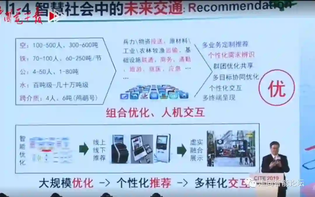 未来交通会产生什么变化?第一,现在所有交通中都要提前订票,飞机可以提前一年订票,高铁提前10到15天订票,汽车也要提前一天买票。经过柔性设计和多元化融合,未来交通通过大数据获取、多元化融合,出行分辨率可以从天降低到小时、分钟级;第二,交通的响应和应急匹配会提升,通过小尺度感知和优化,出行方便率将从千米级缩小到米级;第三,可以实现多样化、个性化的交通推荐,出行分辨率将从群体级细化到个人级,每个人都可以享受到多样化、个性化的服务。在区域智联网中,所有车在行驶过程中,按照你自己的路线随便走而不会相撞。在实现自主交通后,因为每个车上,包括自行车上都有AI能力,可以智联协同、自主避让。