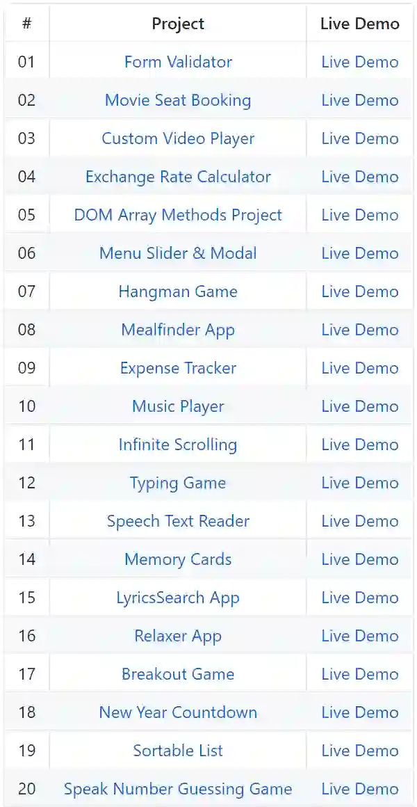 本文和大家分享一个项目,这是一个使用HTML5,CSS和JavaScript构建的20多 个小型项目的集合,值得一提的是,这些项目没有用到任何框架和库。