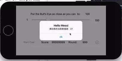 和之前一样,我们创建并显示一个提示对话框UIAlertController,不过这一次的内容变了,我们使用message代替之前的文字内容,而message的内容则使用currentValued的数值来定义。