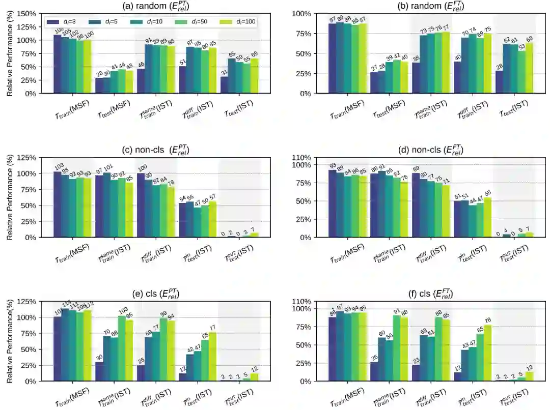 训练-测试任务的划分会对结果有很大的影响。比如在cls划分中,训练时找到的本征子空间可以在分类的测试任务上有比较合理的表现,但在非分类的测试任务上表现很差。