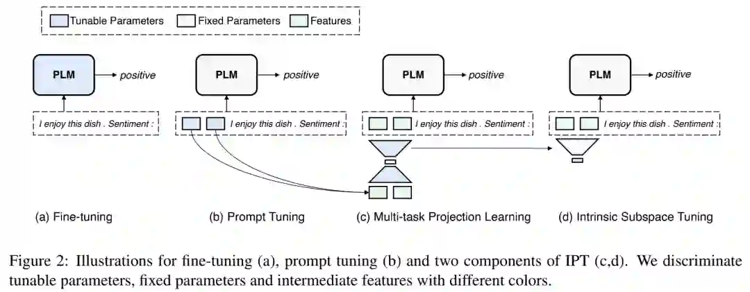 下图展示了 IPT 与 fine-tuning 和 prompt tuning 的对比。