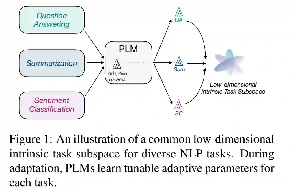 本文对任务低维本征子空间的探索是基于 prompt tuning, 而不是fine-tuning。原因是预训练模型的参数实在是太多了,很难找到这么多参数的低维本征子空间。作者基于之前的工作提出了一个基本的假设: 预训练模型在不同下游任务上学习的过程,可以被重新参数化(reparameterized)为在同一个低维本征子空间上的优化过程。如下图所示,模型在不同的任务上学习的参数虽然不同,但这些参数共享了同一个低维本征子空间。