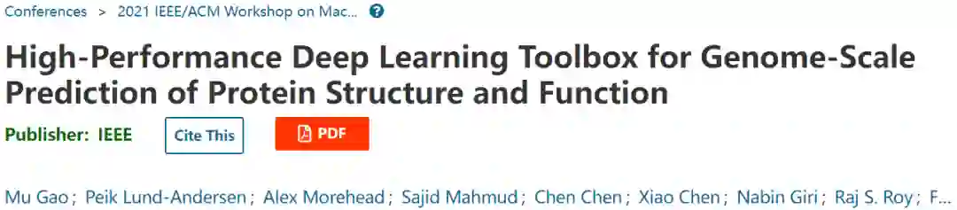 该研究以「High-Performance Deep Learning Toolbox for Genome-Scale Prediction of Protein Structure and Function」为题,于 2021 年 11 月 15 日在《2021 IEEE/ACM 高性能计算环境中的机器学习研讨会 (MLHPC)》上发布,于 2021 年 12 月 27 日添加在《IEEE Xplore》。