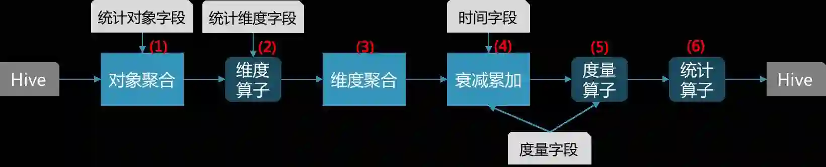 计算统计量。经过对象和维度聚合后,对象、维度、度量值建立了二级映射关系:对象维度度量值,相当于一个二维Map:Map<对象, Map<维度, 度量值>>。统计量是对Map<维度, 度量值>做一个聚合操作。每个统计量对应输出Hive表中的一个字段。现在主要支持如下几种算子: