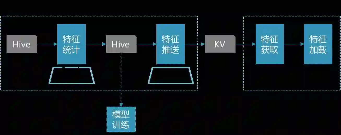 离线统计得到的特征存储在Hive表中,出于性能的考虑,不能在线上直接访问。我们需要把特征从Hive中推送到更为高效的KV数据库中,线上服务再从KV中获取。整个同步过程可以分为如下步骤: