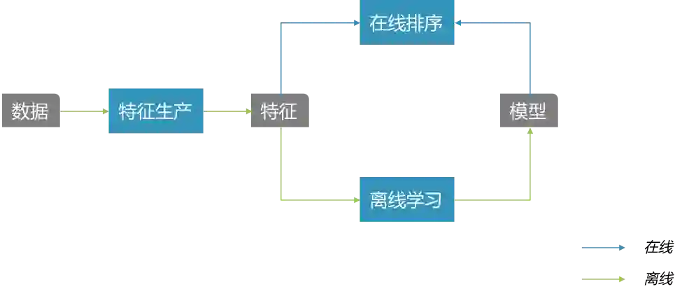 外卖排序系统使用GBDT(Gradient Boosting Decision Tree)树模型,比较复杂。受限于计算能力,除了上下文特征(如时间、地域、终端类型、距离等)之外,目前使用的主要是一些宽泛的统计特征,比如商家销量、商家单均价、用户的品类偏好等。这些特征的生产流程包括:离线的统计、离线到在线的同步、在线的加载等。