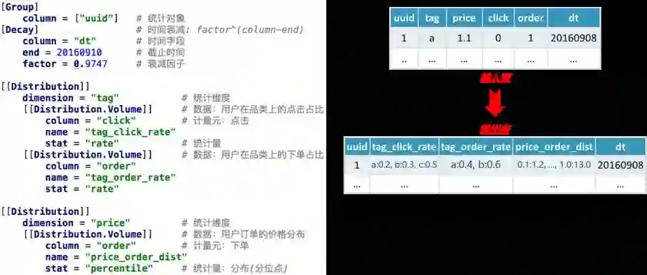 如下是统计用户点击品类偏好、用户下单品类偏好、用户下单额分布的配置文件和Hive表示例([Toml][1]格式)