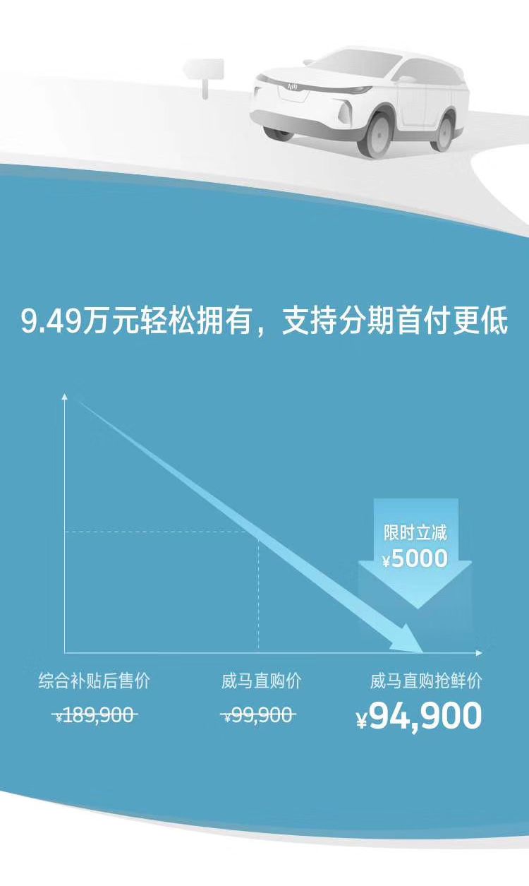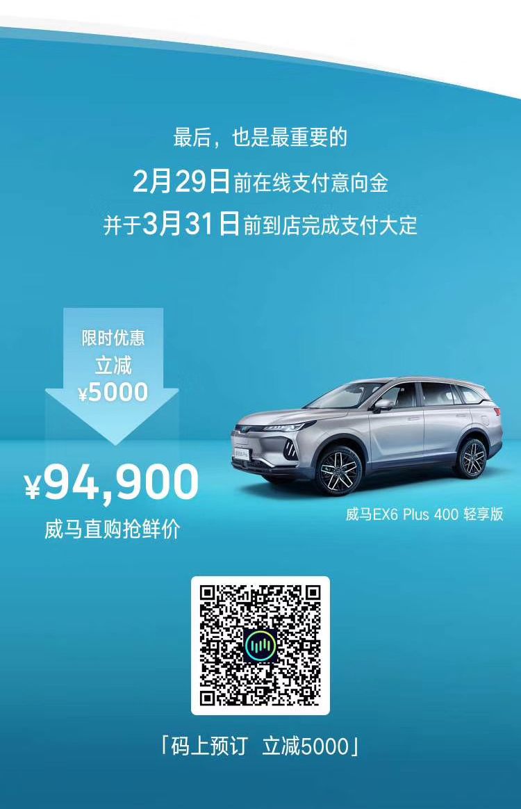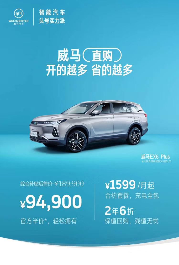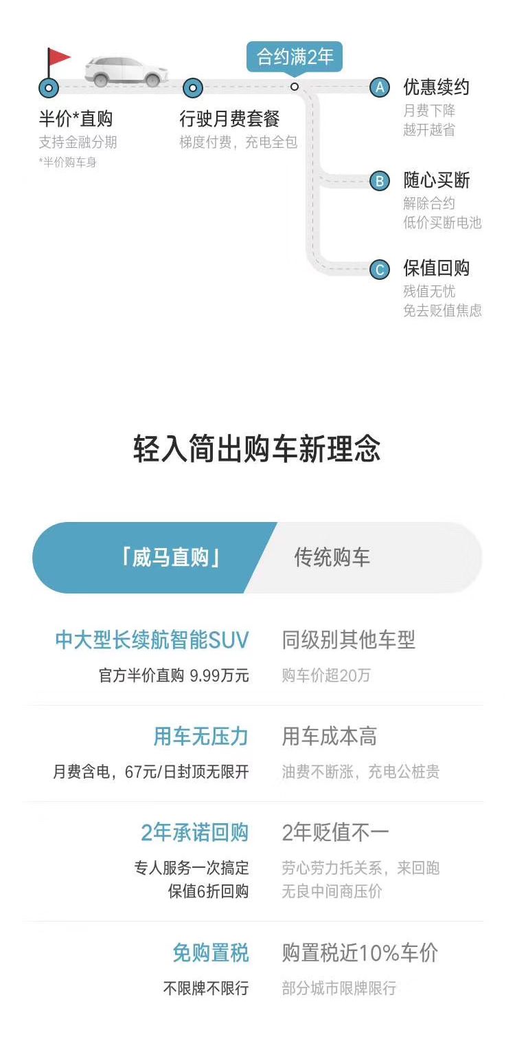 威马直购,与燃油车争食肺炎疫情这起黑天鹅事件瞬间加大了新造车公司的生存压力,创新求变无疑成为突围的重要筹码。威马汽车率先亮剑,这个利器就是“威马直购”。2020年春节前夕,威马汽车发布“威马直购”新零售模式,用户仅需首次支付9.49万元就能半价获得威马EX6 Plus 400轻享型,之后每月根据行驶里程择0-1500公里、1501公里-不限里程两档出行套餐,对应的月费分别是1,599元(约53元/日)、2,099元(约66元/日)。这个月费并不是传统意义上的分期贷款,而是可以用来充抵充电费用,相当于电信运营商推出的合约手机月费套餐,之前是“充话费送手机”,现在相当于是“充电费送车”。据悉,目前威马直购目前只针对威马EX6 Plus 400轻享版车型(综合补贴后售价18.99万元),这款车NEDC续航里程为400km。根据官方所公布的直购服务来看,消费者可以选择2年、4年和6年三个合约方案,到期后用户可买断电池、可以更优惠的价格续约,或者由威马官方保值回购。 这显然是一个创新的打法。李斌在谈到创立蔚来时曾说过,要选择一套让电动车与燃油车用车体验差别不大,但同时价格合理的模式,他的解决方案是换电。而威马的策略无疑更为激进,直接将整车价格下探至10万元以下,这是销量最广的燃油车的售价区间,相当于把电动车的市场触角直接深入燃油车腹地,开始与燃油车直接争食。为什么推出“威马直购”模式的是威马汽车?一位威马员工认为,一个重要原因是威马坚持了“开放融合”的合作理念,过去一年多在服务领域进行了大量拓展,“在充电服务领域,威马即客行已经携手国家电网、特来电、星星充电等12家主流运营商,接入超20万根公共充电桩,覆盖全国约43%的公共充电桩。值得一提的是,长途出行时,国家电网”十纵十横两环”的高速快充网络,能够提供便捷的大功率直流快充服务,进一步拓展用户的出行半径,实现从”城内出行畅行无阻"向"城际出行无忧"的跨越。”2019年的新能源车行业遭遇了多重打击,影响最大的显然是排放标准的切换。多位新造车公司负责人向36氪表示,“国标切换带来的燃油车甩货,对三四线城市的新能源车销量伤害深远,不光掉单达到15%到20%左右,甚至还侵占了未来新能源车的潜在市场。”而如何撕开这个口子,在产品体验和服务不输于甚至明显领先于传统燃油车的前提下,价格显然是最直接的利器。面对2020年更加残酷的生存形势,威马显然已经攥住了“威马直购”这张销量船票。