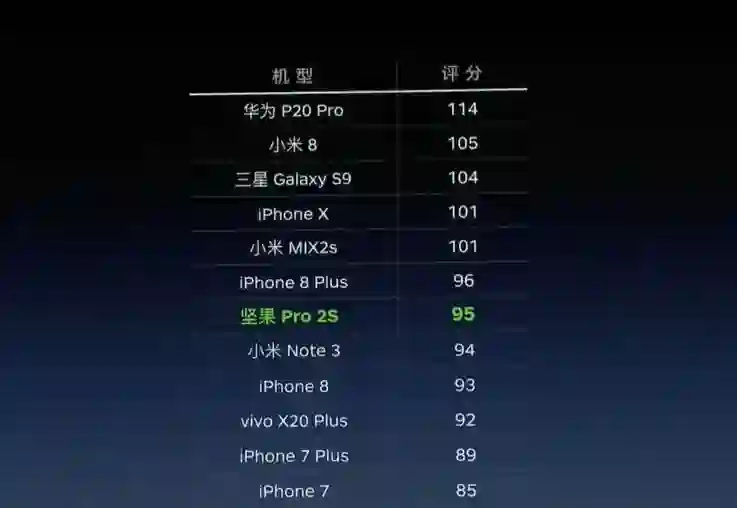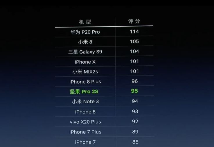 “坚果Pro 2S摄像头评分达95分,这个成绩次于iPhone 8 Plus,超过了iPhone 8。” 同时,罗永浩特别强调:“注意了,我们这是一款中端机型。”