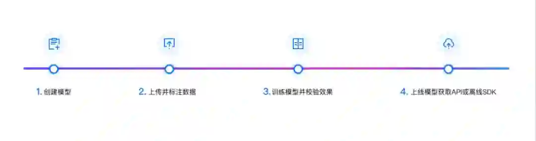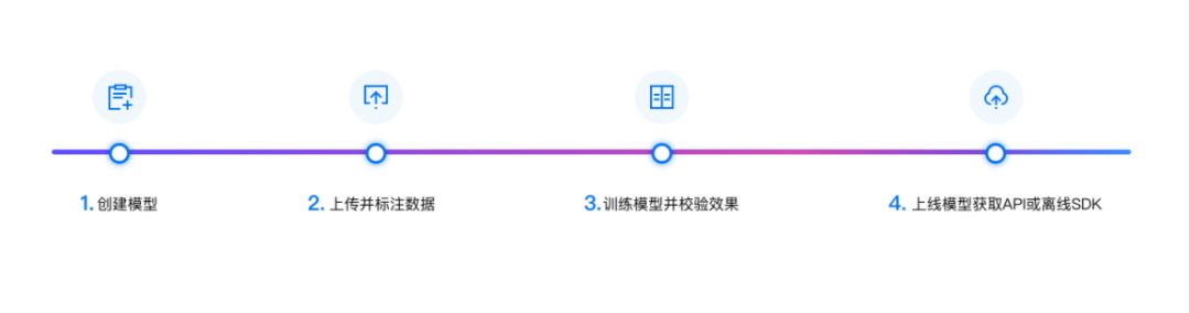 如下所示为 EasyDL 训练模型的基本流程,整个过程都是图形化操作,且如果是上传已经处理好的数据,那么强大的迁移学习系统会在几分钟内完成模型的训练。百度 AI 开放平台文档中心对 EasyDL 的建模过程有详细的描述,因为这一图形化的系统非常简明,所以文档也通俗易懂。
