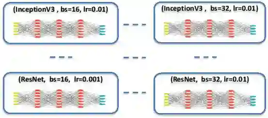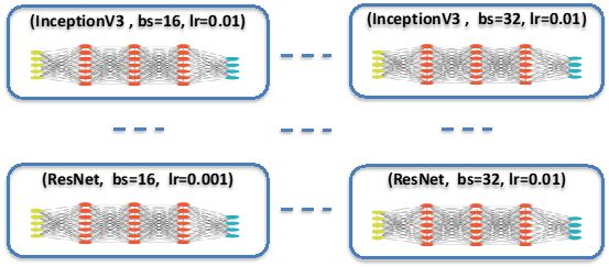 其实 Auto Model Search 是针对特定用户数据的,在用户上传与他们任务相关的数据后,EasyDL 会抽取多个已训练深度网络,并采用迁移学习和不同的超参配置精调这些深度网络。如下所示在用户确定好小型数据集后,EasyDL 可能会选择 Inception v3/v4 和 ResNet 等,在固定这几个网络前面层级的权重后,系统会根据用户数据以及不同的批量大小和学习率训练网络。