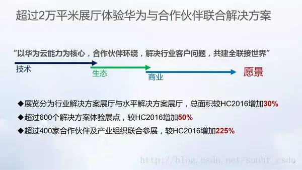 实际上,华为创办全联接大会的目的,就是为了实现共建全联接世界的美好愿景。华为通过全联接大会,搭建产业开放、合作的全球共享平台,通过构筑平台开放能力,最终释放整个ICT产业的生产力和创新潜力,推进社会进步。而云在这其中,将扮演非常重要的平台角色,这也是为什么连续两届华为全联接大会都始终围绕着云展开的原因。HC 2016的重点在于讨论如何塑造云,如何将全面云化作为数字化的核心驱动力,以最深刻的方式改变个体行为,商业模式,经济格局,甚至社会形态,在数字化革命,产业价值再分配过程中,实现更大的商业价值,产生新的商业竞争力。而HC 2017的重点将是如何落地云,因此将会更加强化实践;邀请更多有实际操作经验的客户和伙伴,分享更多成功案例;展示更多基于实际场景的解决方案,让受众有更多体验 ;提供更多交流的机会,激发更多商业合作。