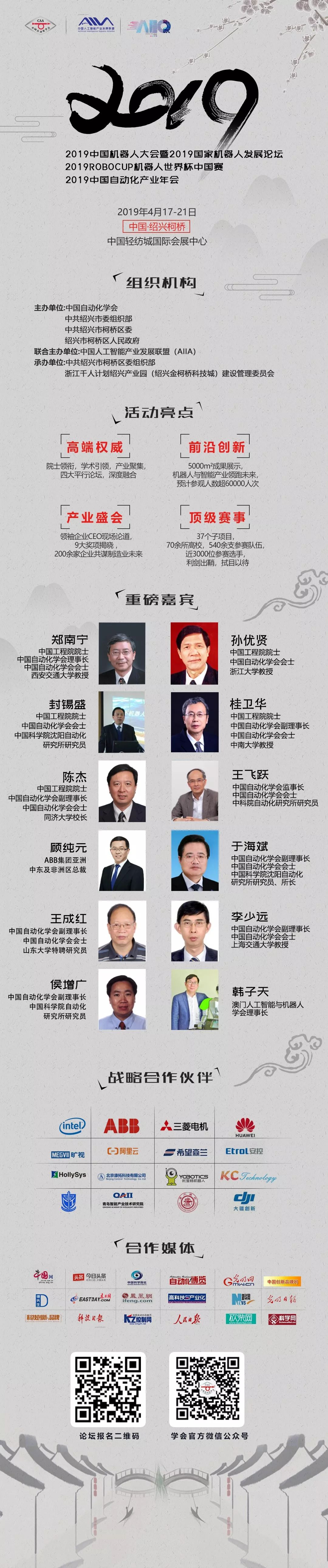 2019年国家机器人发展论坛将于2019年4月17-21日在浙江绍兴举办,敬请关注学会官方微信公众号和网站,了解最新论坛信息。