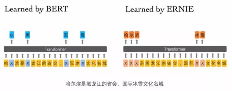 在 BERT 模型中,通过『哈』与『滨』的局部共现,即可判断出『尔』字,模型没有学习与『哈尔滨』相关的知识。而 ERNIE 通过学习词与实体的表达,使模型能够建模出『哈尔滨』与『黑龙江』的关系,学到『哈尔滨』是『黑龙江』的省会以及『哈尔滨』是个冰雪城市。