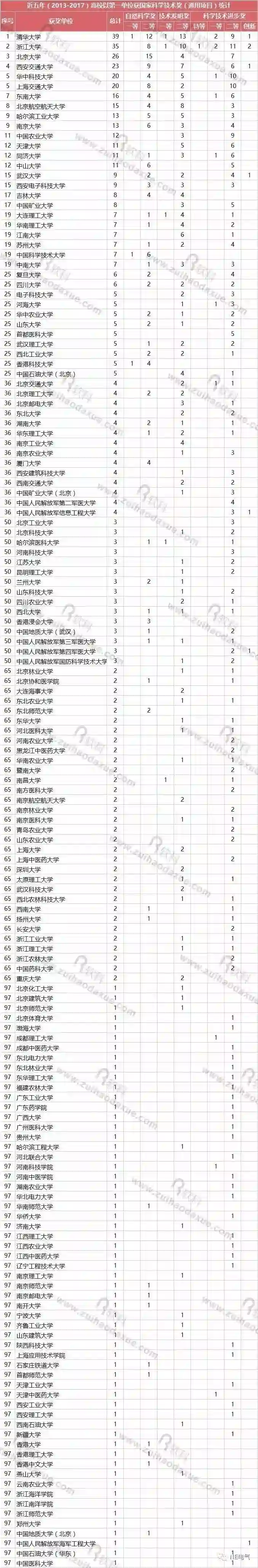 根据最好大学网给出的2013年至2017年中国高校获得国家“三大奖”(通用项目)统计数据来看,清华大学以第一完成单位共获奖39项,获奖总数位居全国高校第一,并且是唯一囊获了国家“三大奖”一等奖的高校。浙江大学以35项获奖数位居全国第二,其中包括了1项技术发明一等奖、1项科学技术进步特等奖和2项科学技术进步一等奖,成为了近五年来第一个以第一完成单位获得科学技术进步特等奖的高校。北京大学以26项获奖数位居第三。紧随其后的是获奖数23项的西安交通大学,西安交通大学还被授予了1项创新团队奖。在非985的211高校中,表现最为出色的是西安电子科技大学,共以第一单位获奖9项。