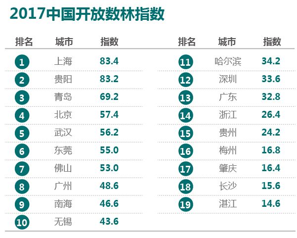 《中国地方政府数据开放平台报告》(以下简称「报告」)在 2017 中国国际大数据产业博览会期间发布。报告从数据集数量、开放授权协议、元数据覆盖率等方面评估地方政府的数据开放平台,发布了「开放数林指数」。