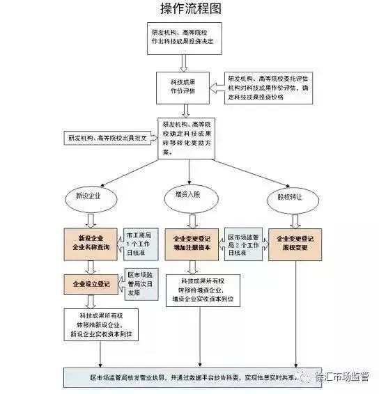 今年年初,科教资源、人才资源得天独厚的上海市徐汇区科委等 5 部门印发了《徐汇区促进科技成果转化操作指导规程》,首次推出科技成果转化注册登记的清晰详细「路线图」(如下)。
