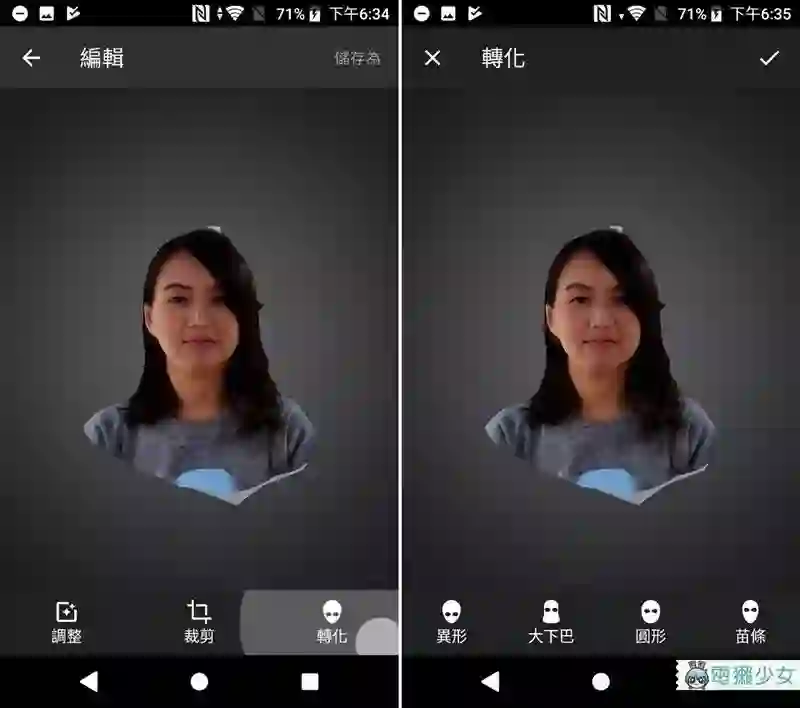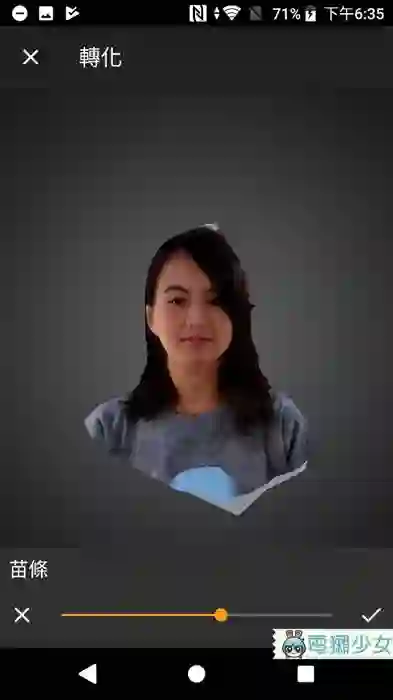 然后蜜柑发现阿,如果拍摄出来的人像不满意的话还可以做微调喔(大笑),因为 3D 扫描出来的人像都…觉得有点胖,还是应该说有点真实(生气惹),只要在“转化”这边就能调整异形、大下巴(?)或苗条等等
