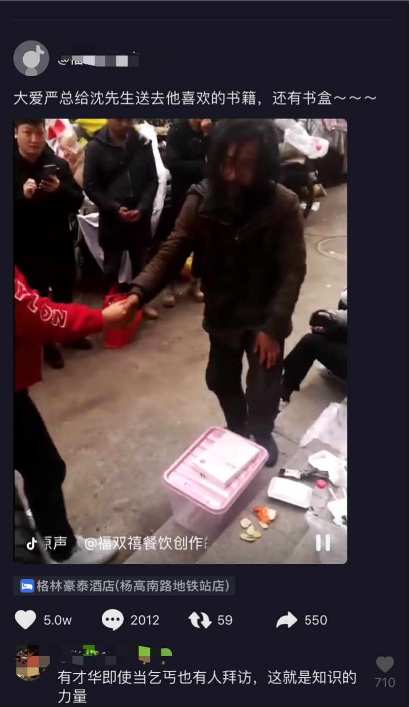 无数盲流子想从他这里沾染上一点“书卷气”,无数网红和营销号想榨干他身上的剩余价值。上海杨高南路地铁站附近似乎变成了一个熙来攘往的“动物园”。