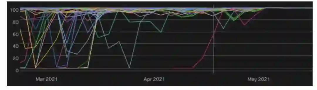 该图表显示了从 2021 年 3 月 1 日到 2021 年 6 月 1 日,我们所有生产集群的第 25 百分点的 Locality 值。在 3 月之前,我们看到许多下降到 90% 以下,一些集群持续下降到几乎 0%。随着我们开始推出 LocalityHealer,这些下降变得不那么频繁和严重。一旦 LocalityHealer 被完全推出,它们就完全被消除了。