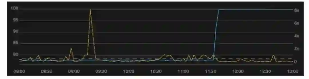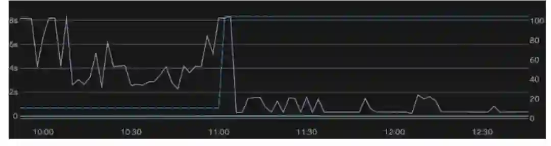 在本例下,我通过绘制单个平均位置(左轴,蓝线)来总结第一个图表。我把集群的第 99 个百分点的延迟叠加在一起(右轴,黄线)。在整个上午,我们看到了越来越多的超时(500 毫秒,用灰色虚线表示)。我们知道,当我们达到流量高峰时,这将变得非常关键,所以在 11:30 运行了 LocalityHealer。Locality 跃升至 100% 后,立即减少了延迟波动和超时的情况。