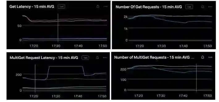 所有这四个图表都有相同的时间窗口。在这个时间窗口开始时,我打乱了处理集群上的 Locality。正如你所看到的,单个 Get 延迟(左上图)没有受到很大的影响,但吞吐量(右上图)却显著地下降了。MultiGets 在延迟(左下角)和吞吐量(右下角)方面受到明显的影响。我们发现,一般来说,MultiGets 对延迟回归格外敏感,因为它们会击中多个 RegionServer,通常至少与最慢的目标一样慢。