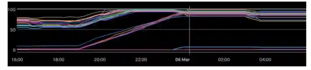 这个集群有一个相对较小的数据集,但负载较重。左轴(浅紫色)是第 99 个百分点的延迟,而右轴(蓝色虚线)是 Locality。在这次事件中 ,Locality 约为 10%,延迟在 2~8 秒之间。利用我们将在本文讨论的工具,我们在 11 点左右解决了这个问题——在短短几分钟内,我们就将 Locality 提高到 100%,并使延迟减少到不足 1 秒。