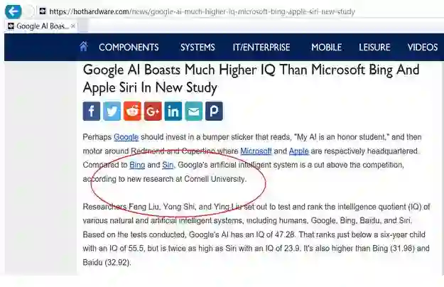 “据HotHardware报道称,来自美国康奈尔大学一组研究人员对各大科技公司的人工智能型语音助手进行了横向比较。研究人员发现,谷歌助手拥有目前语音助手类中最高的平均智商,IQ值约为47.28,水准接近于人类六岁儿童。而苹果的Siri语音助手的平均智商则较低,约为23.9,考虑到Siri助手的诞生早于谷歌助手,谷歌近年来在AI研究领域的发展是非常令人印象深刻的,研究同时也提到了中国百度团队的AI也取得了长足的进步。”