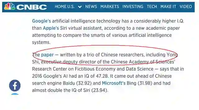 这项研究的真实出处是中国科学院虚拟经济与数据科学研究中心,由计算机博士,互联网进化论作者刘锋,中国科学院虚拟经济与数据科学研究中心主任石勇教授,中国科学院经济管理学院刘颖副教授组成的研究团队完成,题目是“人工智能的智商评测与智能等级研究”(Intelligence Quotient and Intelligence Grade of Artificial Intelligence),研究论文发表在2017年Annals of Data Science期刊上。