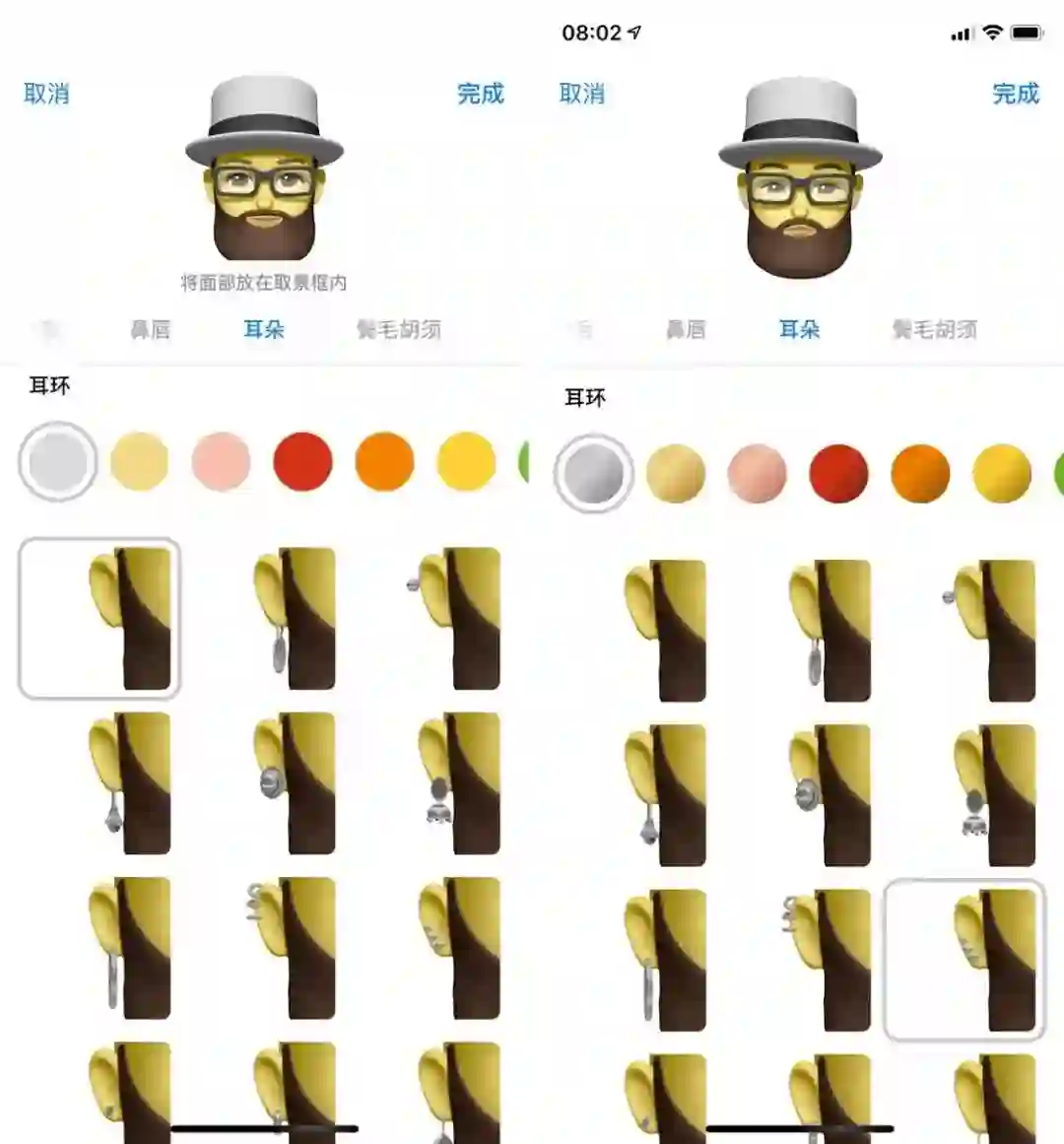 而 Memoji 耳朵选项中,耳环可选颜色从原先略显单调扁平变成了金属光泽,略带渐变效果,并且支持调节颜色深浅。